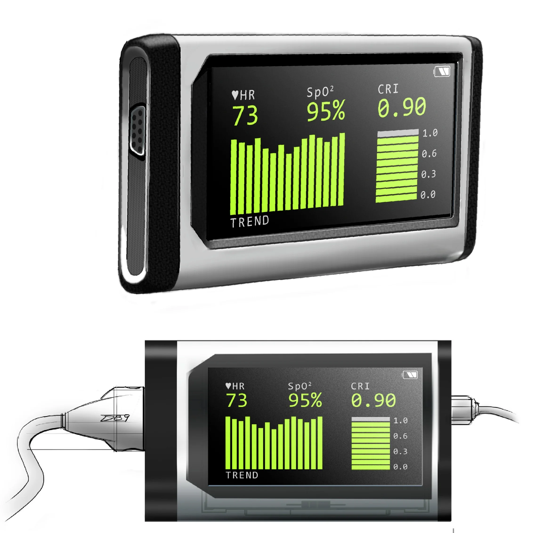 Our team was commissioned to give physicality to an innovative, blood monitoring algorithm that existed on a small set of printed circuit boards. The device would calculate and display heart rate, blood-oxygen (SpO2) and the Compensatory Reserve Index (CRI) using one, simple finger-clip sensor input. CRI is a breakthrough hemodynamic parameter that provides real-time, noninvasive indication of changes in intravascular volume relative to the individual patient’s response to blood loss. Put simply, how much blood is in the patient as a percentage of maximum.